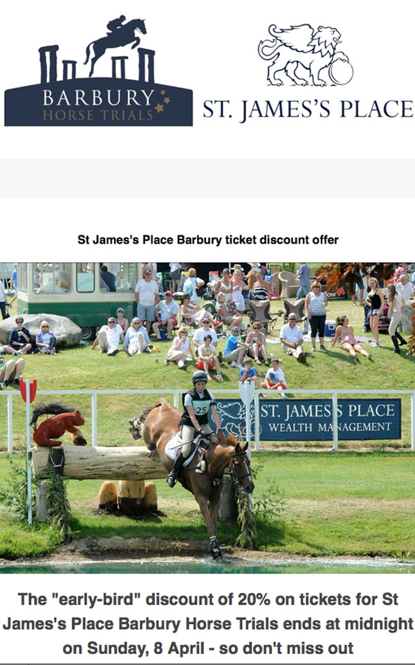 The St James's Place Barbury International Horse Trials in July have initiated a discount ticket scheme - but hurry, hurry it ends at midnight on Sunday, April 8.
